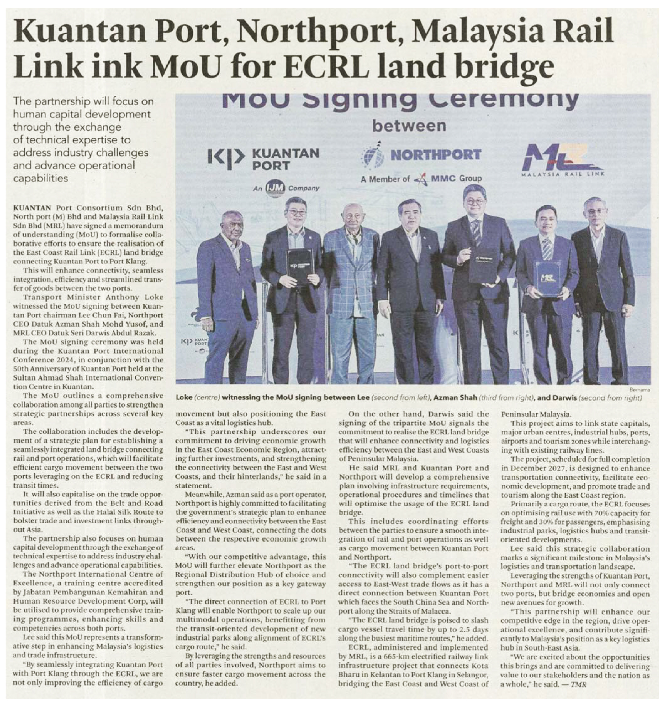 Kuantan Port, Northport, Malaysia Rail Link ink MoU for ECRL Land Bridge